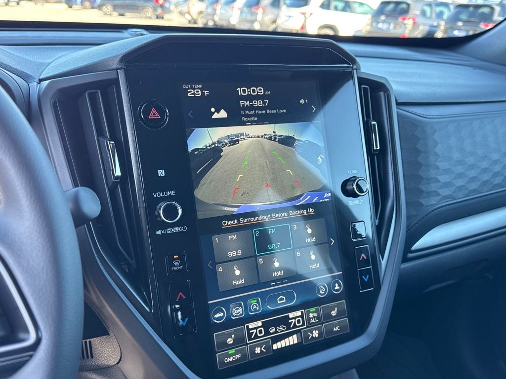 This vehicle includes the following features: Power Rear Gate and Blind Spot Detection with Rear Cross Traffic Alert (Automatic Emergency Steering, Blind-Spot Detection (BSD)/RCTA System, Emergency Lane Keep Assist, and Power Rear Gate), 4-Wheel Disc Brakes, 6 Speakers, ABS brakes, Air Conditioning, Alloy wheels, AM/FM radio: SiriusXM with 360L, Anti-whiplash front head restraints, Auto High-beam Headlights, Auto-Dimming Exterior Mirror with Approach Light, Auto-Dimming Mirror with Compass and HomeLink, Automatic temperature control, Brake assist, Bumpers: body-color, Driver door bin, Driver vanity mirror, Dual front impact airbags, Dual front side impact airbags, Electronic Stability Control, Emergency communication system: MySubaru Companion (5-years free), Exterior Parking Camera Rear, Four wheel independent suspension, Front anti-roll bar, Front Bucket Seats, Front Center Armrest, Front dual zone A/C, Front fog lights, Front reading lights, Fully automatic headlights, Heated door mirrors, Heated Front Bucket Seats, Heated front seats, Illuminated entry, Knee airbag, Leather steering wheel, LED Upgrade, Low tire pressure warning, Occupant sensing airbag, Outside temperature display, Overhead airbag, Overhead console, Panic alarm, Passenger door bin, Passenger vanity mirror, Power door mirrors, Power driver seat, Power moonroof: Panoramic, Power steering, Power windows, Premium Textured Cloth Upholstery, Radio data system, Radio: Subaru 11.6 Multimedia Plus System, Rear anti-roll bar, Rear seat center armrest, Rear window defroster, Rear window wiper, Remote keyless entry, Security system, Speed control, Speed-sensing steering, Split folding rear seat, Spoiler, Steering wheel mounted audio controls, Sunshade - Windshield, Tachometer, Telescoping steering wheel, Tilt steering wheel, Traction control, Trip computer, Variably intermittent wipers, and Wheels: 17 x 7.0 J Dark Metallic Aluminum-Alloy.