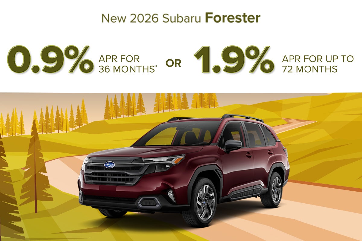 *New 2026 Subaru Forester. 0.9% APR for 36 months. $28.16 per month per every $1,000 borrowed. OR 1.9% APR for up to 72 months. $14.71 per month per every $1,000 borrowed. With approved credit through Subaru Motors Finance. Not all buyers will qualify. On select models. If provided, Advertised Price EXCLUDES all optional dealer offered items, accessories, or product addendums optionally selected by the purchaser, dealer document processing fee of $797 per TCA 55-17-114, and state and local taxes, tags, registration, and title fees. Advertised prices INCLUDE factory-installed options installed by the manufacturer and non-optional dealer-installed accessories present at time of advertising. See dealer for details. Offer expires 04/30/2026.