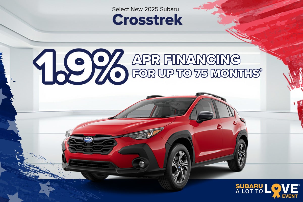 *Offer valid on select new 2025 Subaru Crosstrek models. 1.9% APR for up to 75 months. $14.15 per month per every $1,000 borrowed for 75 months. With approved credit. Not all will qualify. Advertised Price EXCLUDES all optional dealer offered items, accessories, or product addendums optionally selected by the purchaser, dealer document processing fee of $797 per TCA 55-17-114, and state and local taxes, tags, registration and title fees. Advertised prices INCLUDE factory-installed options installed by the manufacturer and non-optional dealer-installed accessories already installed on the vehicle by the dealer at time of advertising. See dealer for details. Offer Expires 3/2/2026.