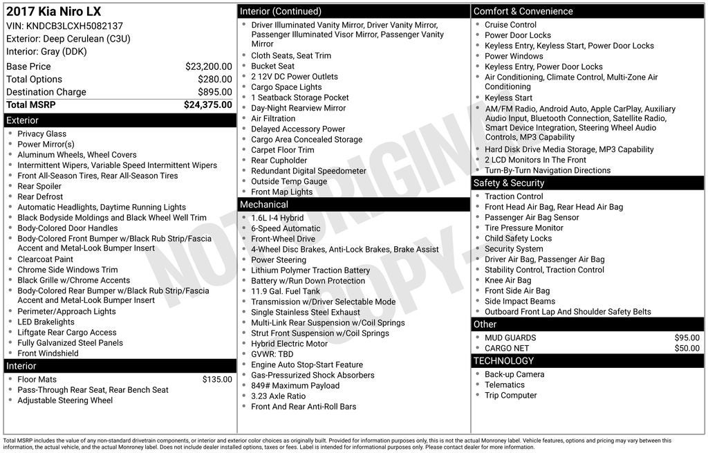 If you're seeking a fuel-efficient, feature-rich, and stylish crossover that checks all the boxes, this 2017 Kia Niro LX is the perfect choice. Experience the difference for yourself and schedule a test drive today. We're confident you'll be impressed by the Niro's exceptional value and performance.