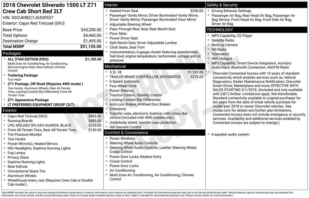- Z71 Package, Off-Road (Requires 4WD model.), includes monotube Rancho brand shocks, (K47) air cleaner, (JHD) Hill Descent Control, (NZZ) underbody shield and (V76) recovery hooks. Also includes brushed metal Z71 door sill plate, unique Z71 gauge cluster, unique finish interior trim plates, unique lower bumper appearance, unique grille design with Z71 badge and Z71 pickup box decals (Includes (Z82) Trailering Package, (G80) locking rear differential and (RD1) 18" bright machined wheels and (RBX) 18" tires. Upgradeable to (RD4) 20" polished-aluminum wheels or 22" LPO wheels. (RD1) 18" bright machined wheels will be replaced with (RX1) 22" LPO wheels when (PDD) Local Market Package (Double Cab), LPO or (PDD) Local Market Package (Crew Cab), LPO is ordered.)