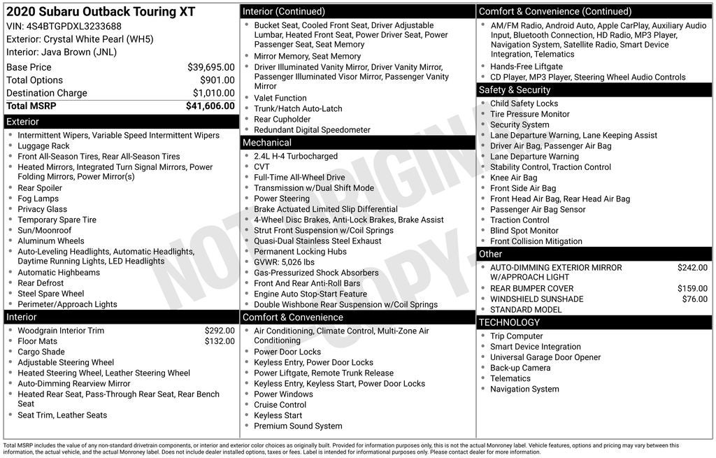 This exceptional Subaru Outback Touring XT is the perfect companion for your next adventure. With its unparalleled combination of capability, comfort, and technology, it's the ultimate vehicle to elevate your driving experience. Visit our showroom today and let us demonstrate why this Outback Touring XT is the perfect choice for you.