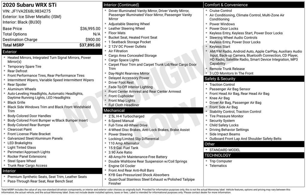 Whether you're carving through winding mountain roads or navigating the daily commute, the 2020 Subaru WRX STi is a true driver's car that delivers an uncompromising blend of power, precision, and poise. Experience the thrill of Subaru's motorsport heritage and schedule a test drive today. This exceptional sports car is waiting to redefine your driving experience.