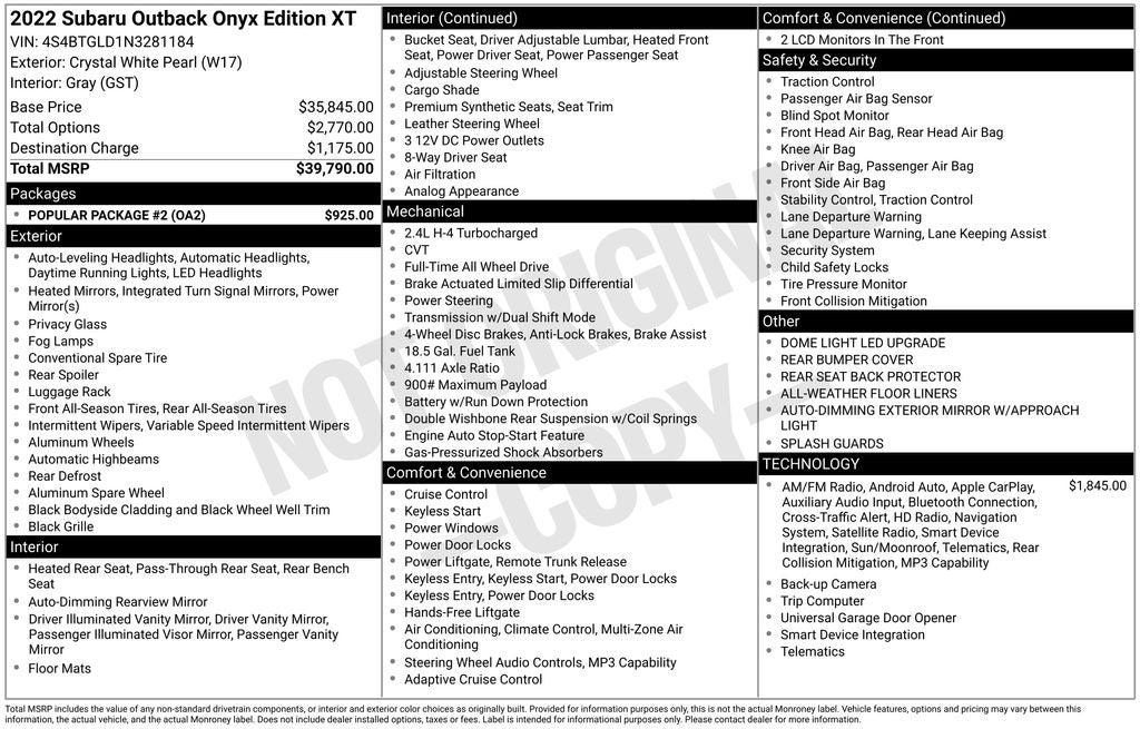 Whether you're embarking on a family adventure, commuting to work, or tackling the great outdoors, the 2022 Subaru Outback Onyx Edition XT is the perfect companion. Experience the perfect blend of capability, technology, and style. Visit our showroom today and let us demonstrate why this exceptional SUV should be your next vehicle.