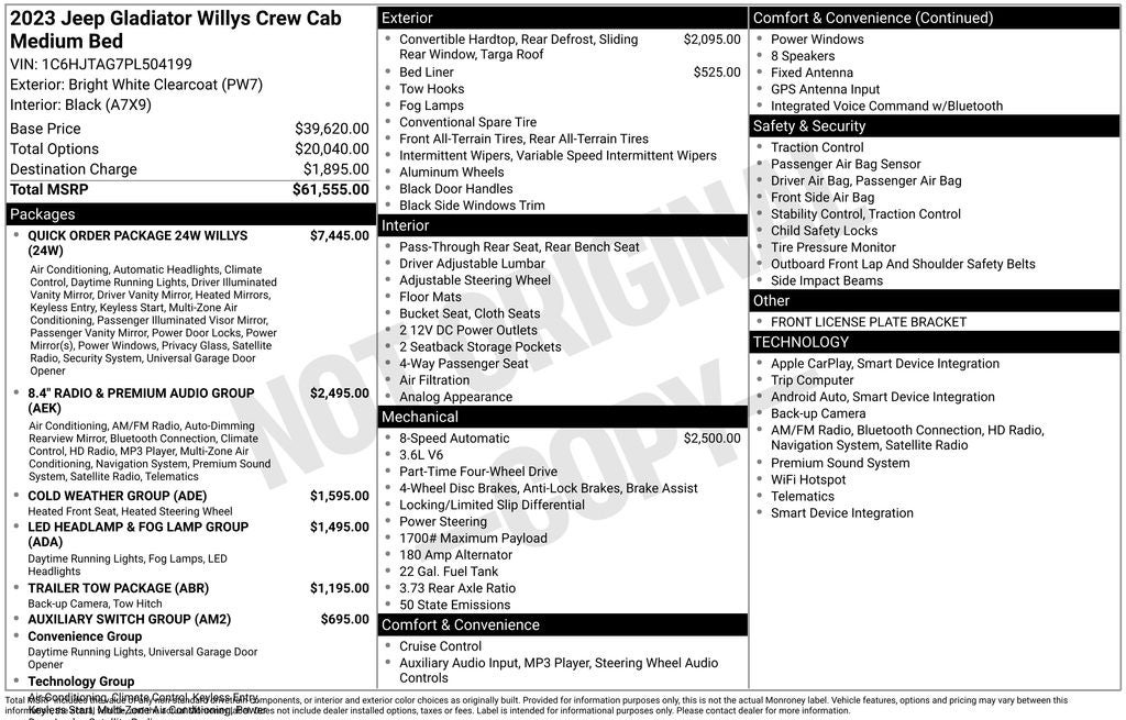 Boasting an impressive array of features, the 2023 Jeep Gladiator Willys is a rugged and capable off-road companion that's ready to take on any adventure. This Gladiator comes equipped with: