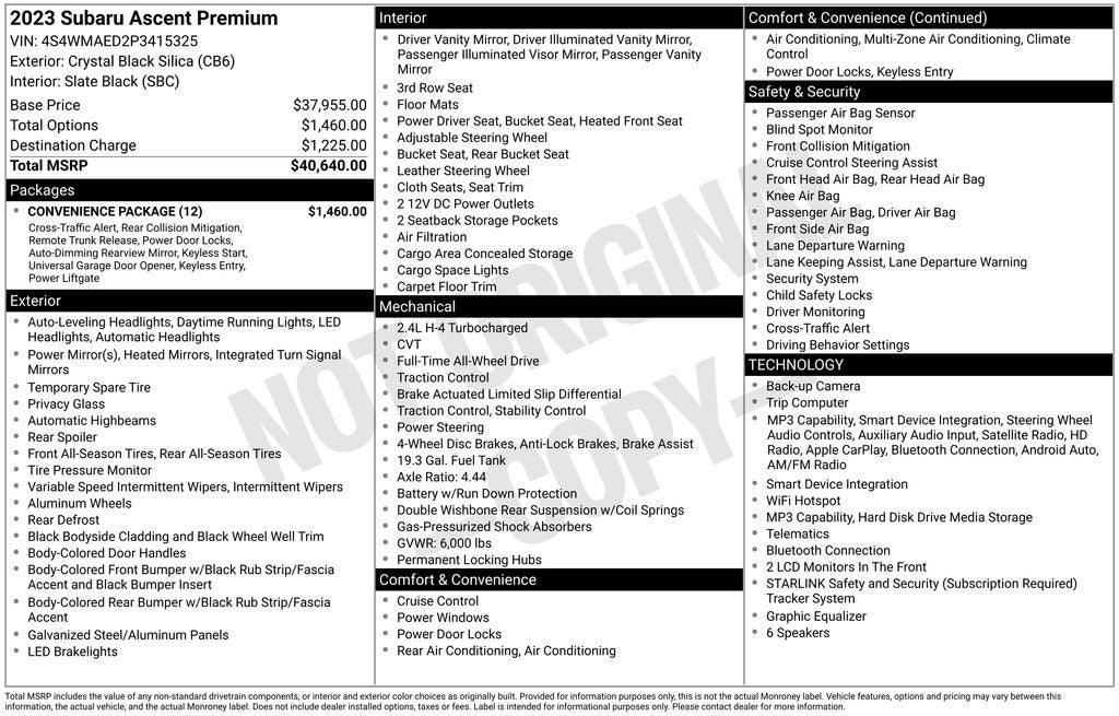 We're confident this 2023 Subaru Ascent Premium will exceed your expectations. Experience the perfect blend of capability, technology, and comfort by scheduling a test drive at our dealership today. We look forward to helping you find the perfect vehicle for your lifestyle.