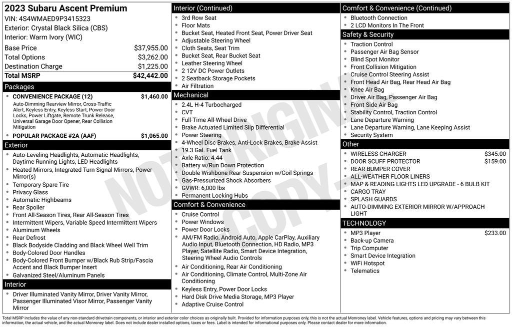 Elevate your driving experience with the 2023 Subaru Ascent Premium. This exceptional SUV combines style, capability, and cutting-edge technology to deliver a truly remarkable driving experience. Visit our showroom today and let us demonstrate how the Ascent Premium can exceed your expectations and become the perfect addition to your lifestyle.