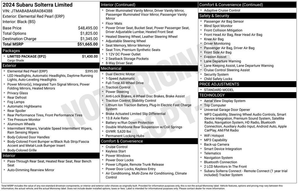 - Radio: Subaru 12.3" Multimedia System -inc: navigation system (navigation subscription required), AM/FM HD radio, Bluetooth® audio streaming and hands-free phone connectivity w/SMS text messaging (refer to subaru.com for cell phone compatibility), SiriusXM all access radio (4 months free trial included/subscription required after), Android Auto and Apple CarPlay w/full screen view and wireless connection, harman/kardon 11 speaker system w/576 watt equivalent maximum output amplifier, multi-touch gesture high resolution display screen, Near Field Communication (NFC), Subaru Solterra Connect intelligent assistant includes dual-zone voice control system w/driver and passenger headliner microphone, steering wheel talk switch, cloud navigation operation, integrated steering operation (subscription required), USB/Over The Air (OTA) audio system updates, USB/Map Over The Air (MOTA) navigation system updates, steering wheel control switches for audio system and Bluetooth®, USB A input/charge port and illuminated dual USB C input/charge port